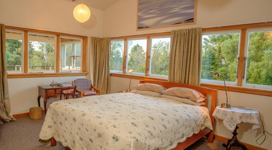 The bellbird room is our largest room on the top floor of the house. With lots of windows, this queen room is lovely and bright, and has views over bush to the east.